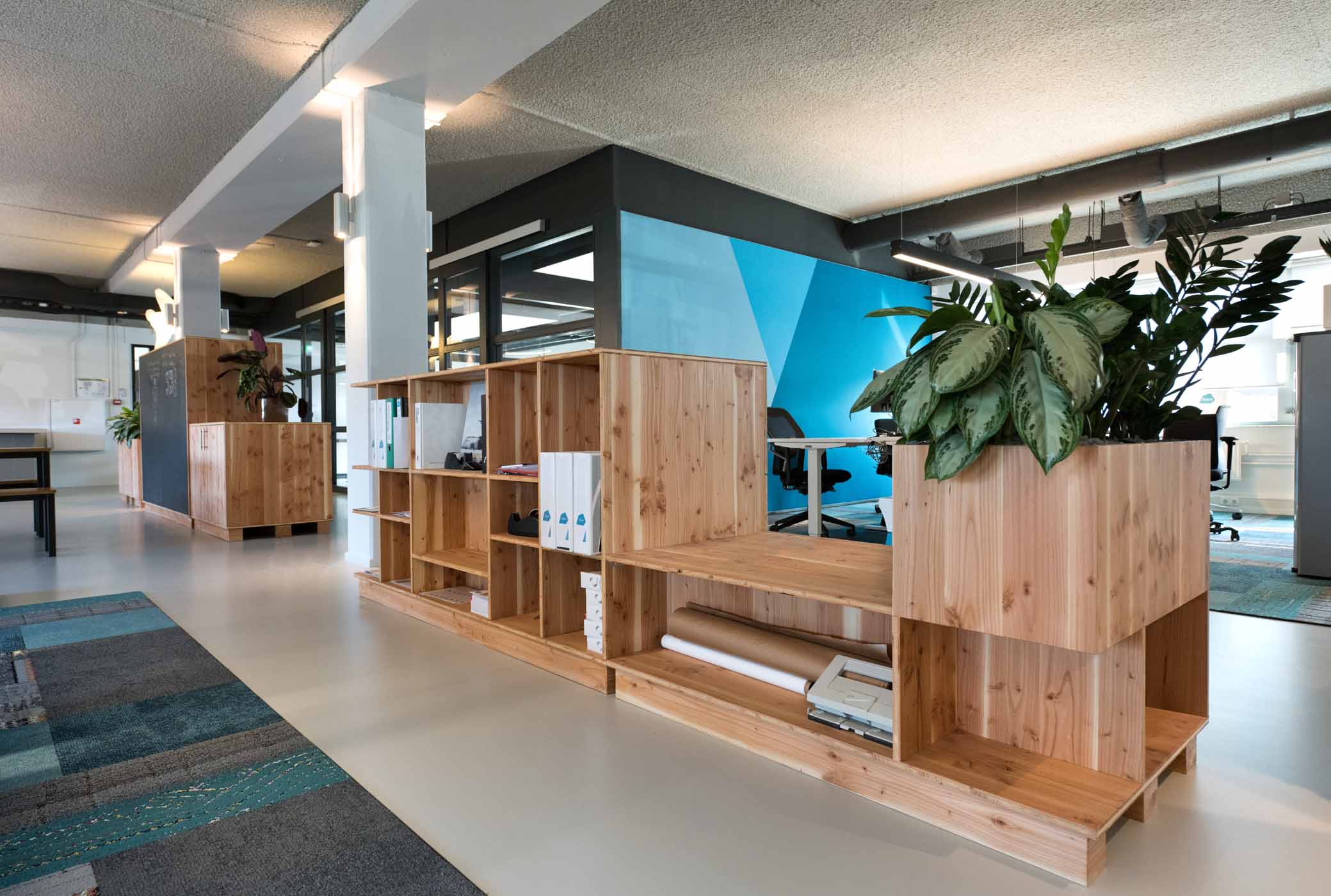 Reusable and flexible material usage fitted in the end really well with the overall (planet proof) concept of the new space and the look & feel the client was looking for.